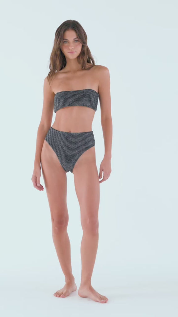 The Murphy Bottom is a classic high-waisted must have piece for all. The fabric is soft and has a touch of lurex. It adjusts perfectly and hugs your curves. The fabric is from Italy. Made in Colombia. 87% Polyamide 7% Elastane 6% Metallic fiber