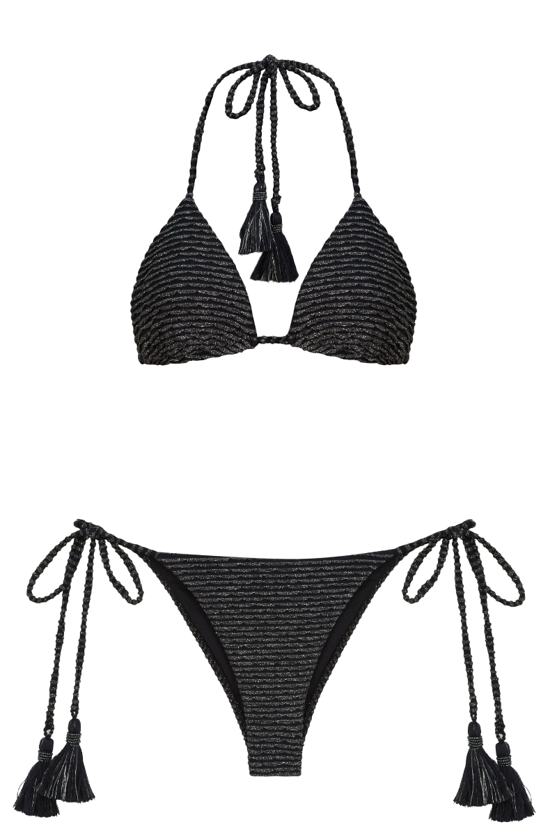 Our Wade Bottom is a classic tie-side design with matching tassels. The fabric is soft and has a touch of lurex. It is adjustable so that you can have just the right fit and it can feel comfortable! This is a must-have bikini bottom for everyone. The fabric is from Italy. Made in Colombia. 87% Polyamide 7% Elastane 6% Metallic fiber